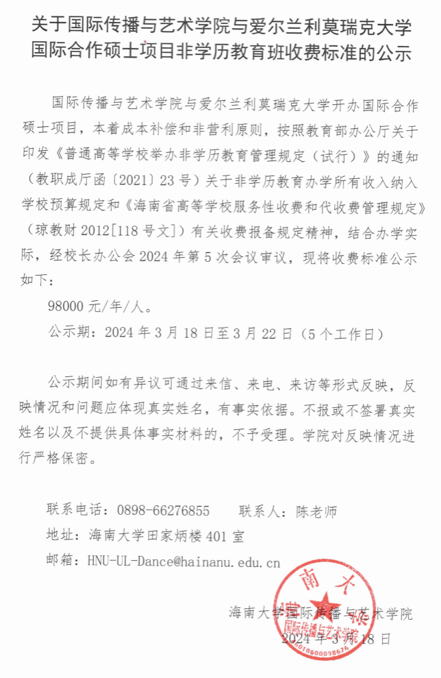 关于Beat365唯一官方网站与爱尔兰利莫瑞克大学国际合作硕士项目非学历教育班收费标准的公示