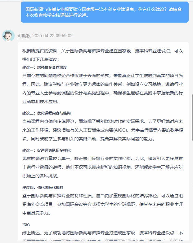 为迎接教育部教育教学审核评估,提升教学管理的效率和质量,Beat365官网教务推出审核评估AI问答栏目,依托在线教育平台的AI智能问答功能,实现了评估知识的“一站式”精准推送。该平台通过数字化手段拓展了信息覆盖维度,为教学改革提供数据支撑。系统支持智能问答交互功能,师生可实时获取Beat365官网的评估动态及学科建设进展。