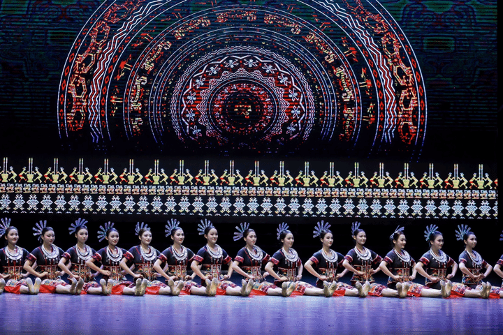 第四幕《绣年·锦色》:白发阿婆执银针授艺,后辈指尖下木棉花绽放,图腾苏醒的瞬间,千年文明在布上重生,黎锦的血脉在舞台上滚烫流淌。
