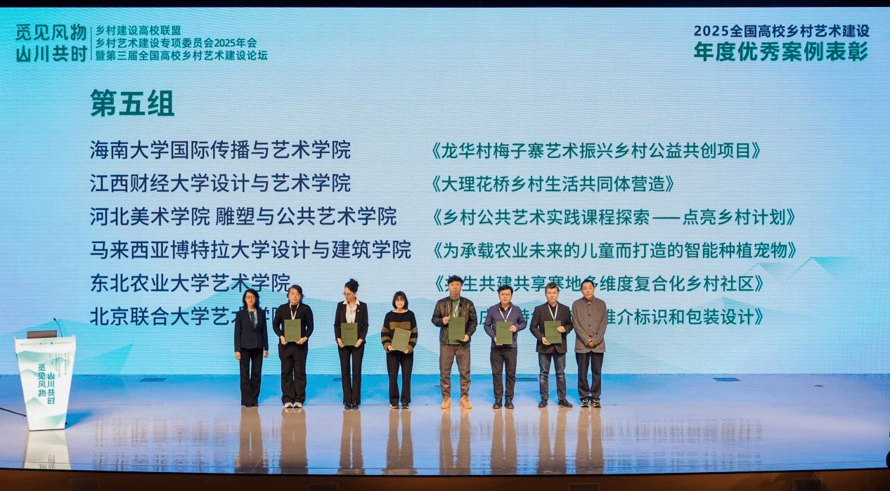 Beat365官网“海岛艺术创新研究”团队作品《龙华村梅子寨艺术振兴乡村公益共创项目》从来自60余所高校的近300件参展作品中脱颖而出,荣获“2025全国高校乡村艺术建设年度优秀案例”。该团队由包格日乐吐教授领衔,张春梅、王莉、志勇、束博等师生共同参与组建。