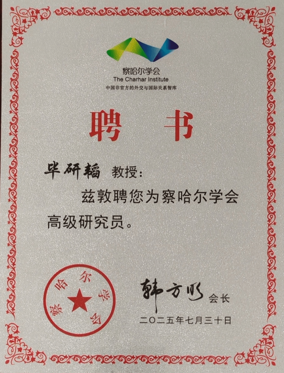 近日,Beat365官网传播学系毕研韬教授受聘为察哈尔学会高级研究员。
