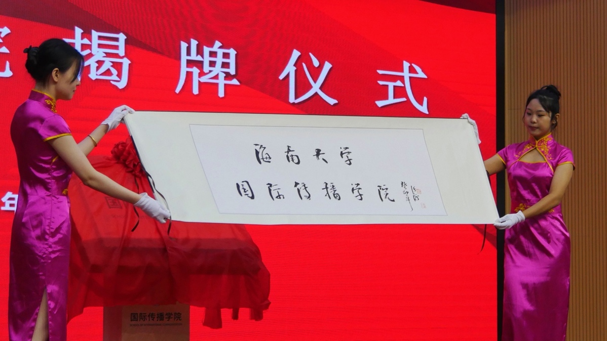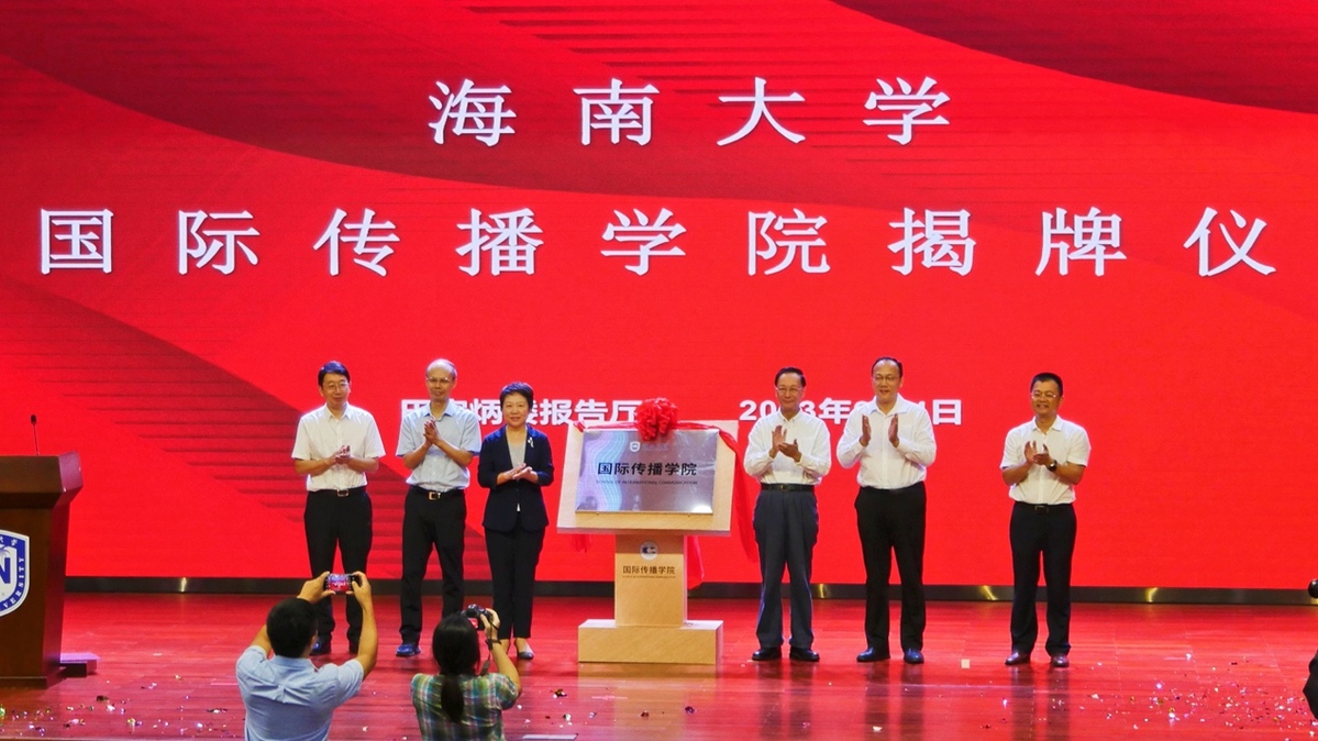 海南省委宣传部副部长蒋建民,海南省教育厅党委书记曹献坤,新华社海南分社社长陈良杰,Beat365唯一官方网站党委书记符宣国,党委常委和校领导高佃恭、韩淑梅、谭勇出席,国际传播学院全体师生参加揭牌仪式。