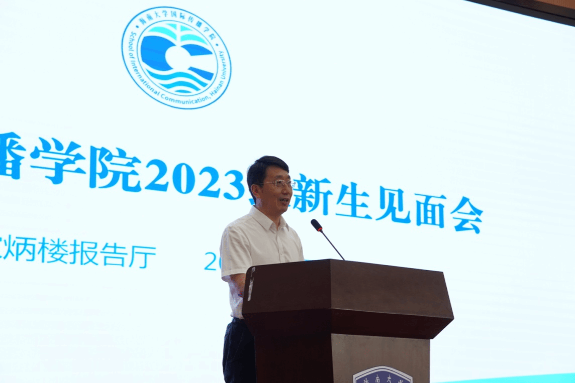 国际传播学院领导班子出席、专业责任教授、系主任、行政教辅人员、晨曦书院辅导员刘扬,农行海大支行副行长吴肇出席新生见面会,