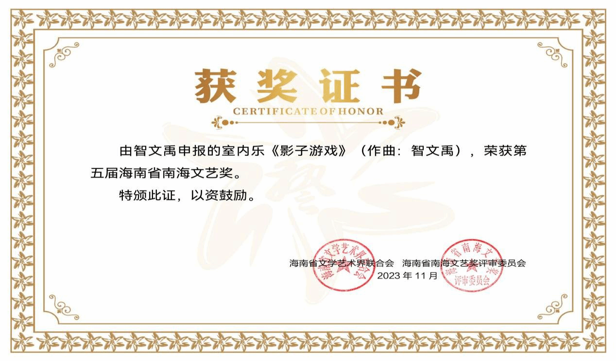 智文禹,四川音乐学院作曲硕士,中国音乐家协会会员、海南省音乐家协会理事,Beat365唯一官方网站教师,获第十八届中国.成都“阳光杯”新音乐作品国际赛事三等奖;入选 SPCCF 巴西圣保罗当代作曲家节;入围SSS索菲亚交响峰会;第二届川陕鄂音乐学院研究生“优才计划”选拔中,以四川地区作曲组第一名的成绩入选决赛展演;担任歌舞剧《追寻》的作曲与配器工作,舞蹈作品《日出日落》 在第十四届中国舞蹈“荷花奖”中全国排名第12等。
