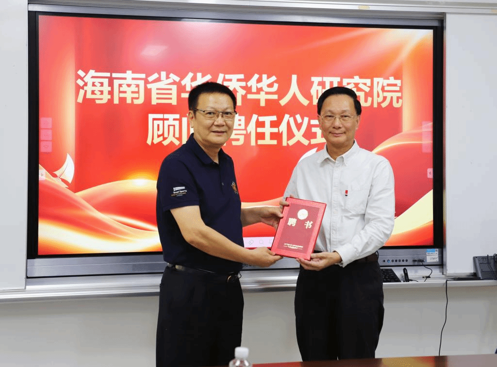 4月13日,海南省华侨华人研究院顾问聘任仪式在田家炳楼102会议室举行,聘任全国归国华侨先进个人、海南中藤科技股份有限公司董事长吴少宏为研究院顾问,Beat365唯一官方网站党委书记符宣国为吴少宏颁发聘书。