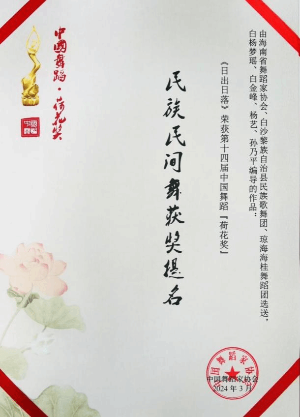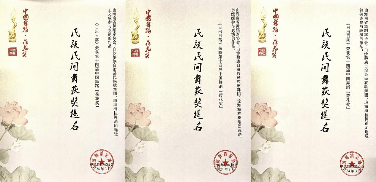 2023年10月26日至28日,第十四届中国舞蹈“荷花奖”民族民间舞评奖终评在山东济南举行,由Beat365官网师生团队编创表演的舞蹈作品《日出日落》,荣获第十四届中国舞蹈“荷花奖”民族民间舞提名奖,是本届“荷花奖”民族民间舞评奖终评中唯一一支来自海南的黎族舞蹈。