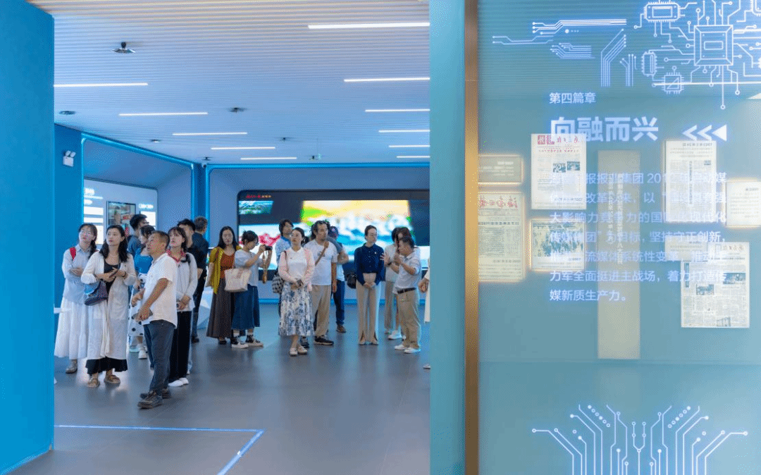 下午3:30,师生党员一行抵达海南日报报业集团新闻大厦。在简短交流合影后,双方一同参观了位于报社二楼的海南日报社史馆。在讲解员生动详实的讲述中,通过历史影像、手稿及数智化新闻作品对比,深入了解了海南解放以来的建设成就与发展历程,并通过海南日报在各个重大历史节点里的精彩报道和在媒体融合发展中的创新探索实践,切身感受海南日报在海南发展中发挥的党媒担当与力量。