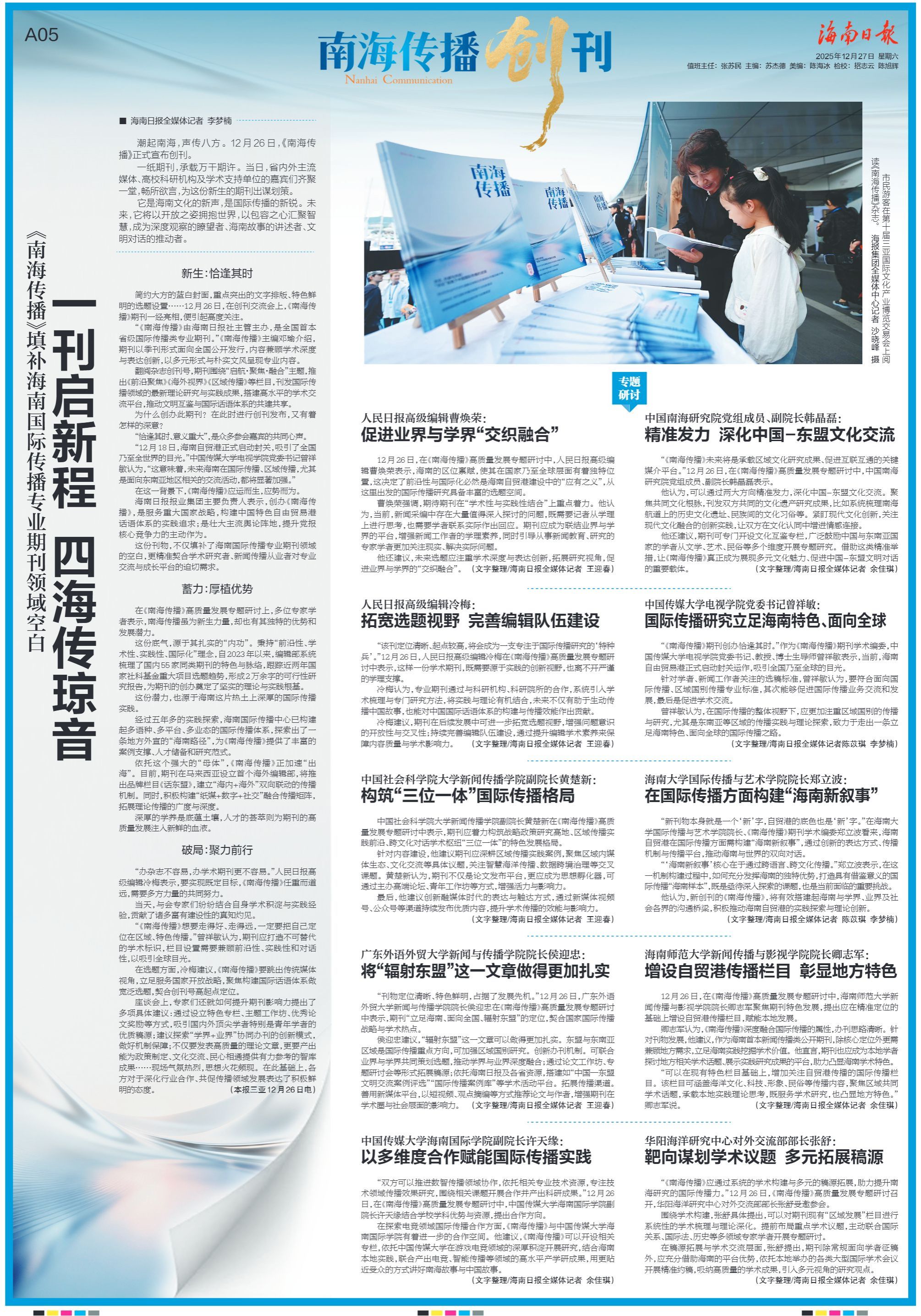 “《南海传播》由海南日报社主管主办,是全国首本省级国际传播类专业期刊。”《南海传播》主编邓瑜介绍,期刊以季刊形式面向全国公开发行,内容兼顾学术深度与表达创新,以多元形式与朴实文风呈现专业内容。